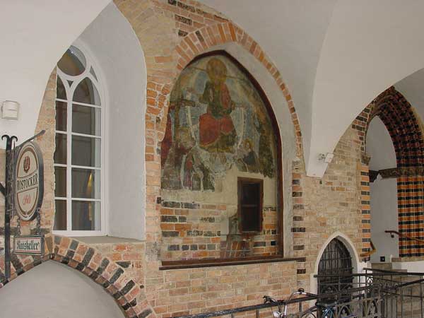 In der Mitte der Wand im Laubengang befindet sich das spätgotische Weltgerichtsfresko,