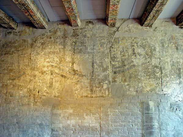 An der ehemaligen Außenwand des Haupthauses ist diese Wandausmalung erhalten.