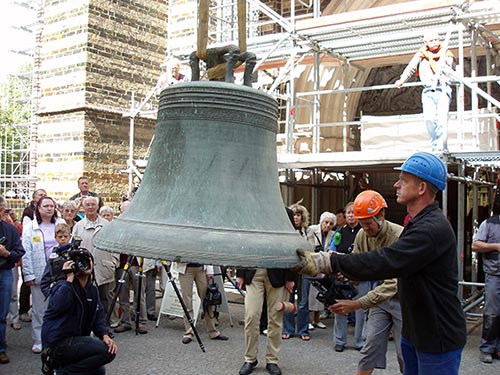 Vor zwei Jahren wurden die historischen Glocken der Marienkirche zur Restaurierung und zur Reparatur gebracht. Udo Griwahn war für das sachgemäße Verladen verantwortlich. Auch als die Glocken im vorigen November zurückkehrten, war er wieder da und sorgte für den Transport bis in den Turm hinein. Dorthin wurde auch die neue Betglocke gebracht, die im Februar 2011 ankam. Anschließend mussten die Glocken auf den Glockenboden gebracht und montiert werden. Damit ist viel Arbeit verbunden, die im März abgeschlossen werden konnte.